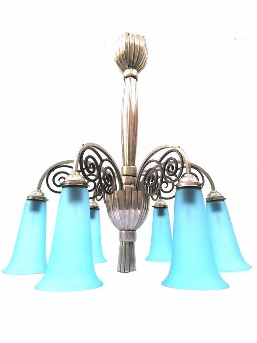 Beautiful nickel-plated Art Deco chandelier, with wrought iron decorations and 6 'Azure blue' matte glass chalices.