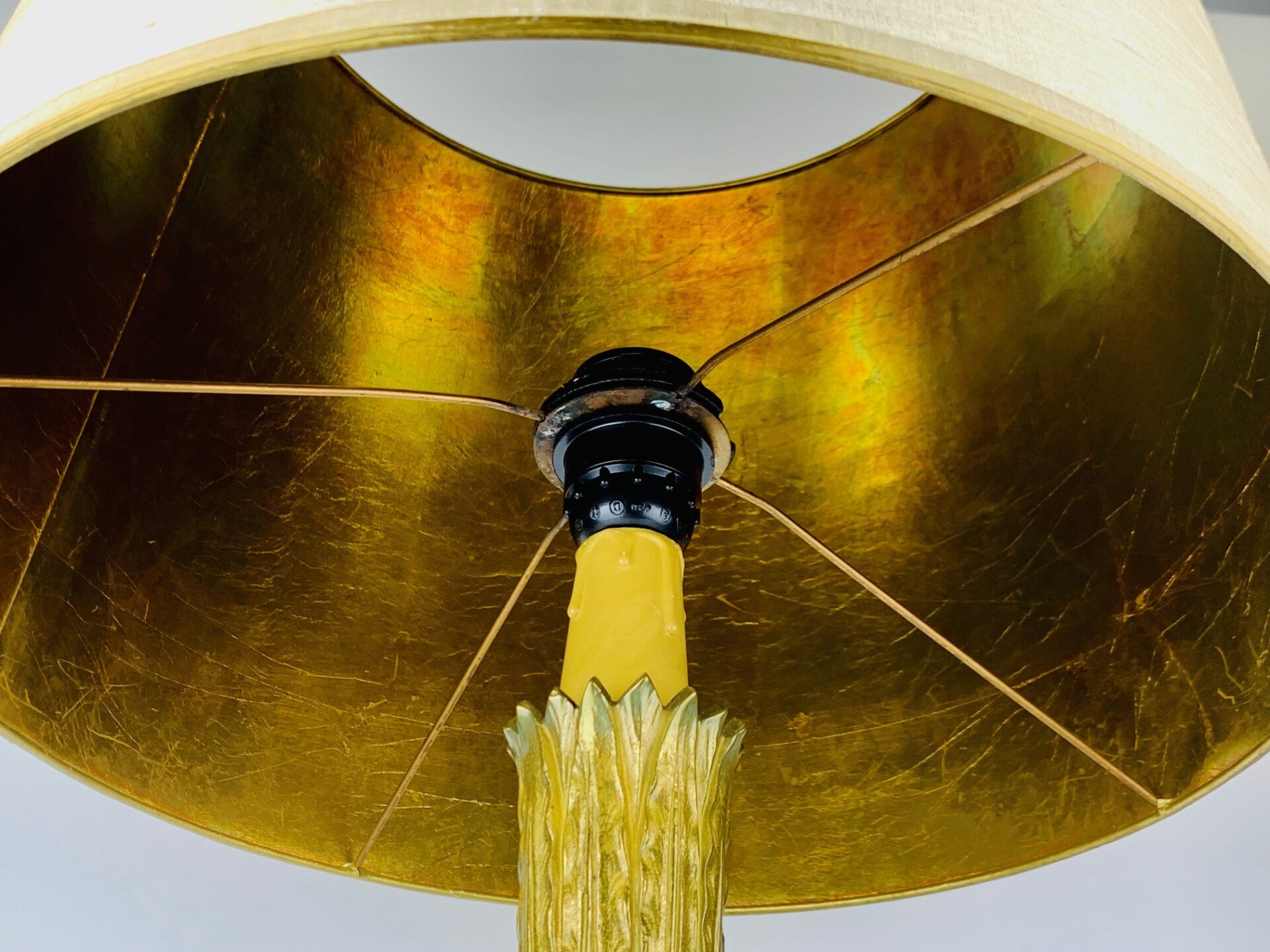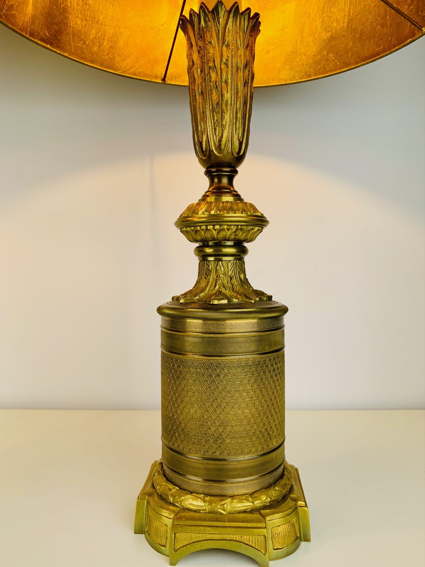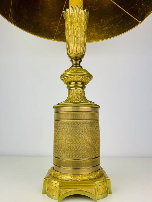 Set of two very beautifully & finely decorated gilt bronze Empire table lamps with acanthus motifs, the base is finished with a bronze laurel wreath. The cylinders are decorated all around with a finely incorporated pattern
