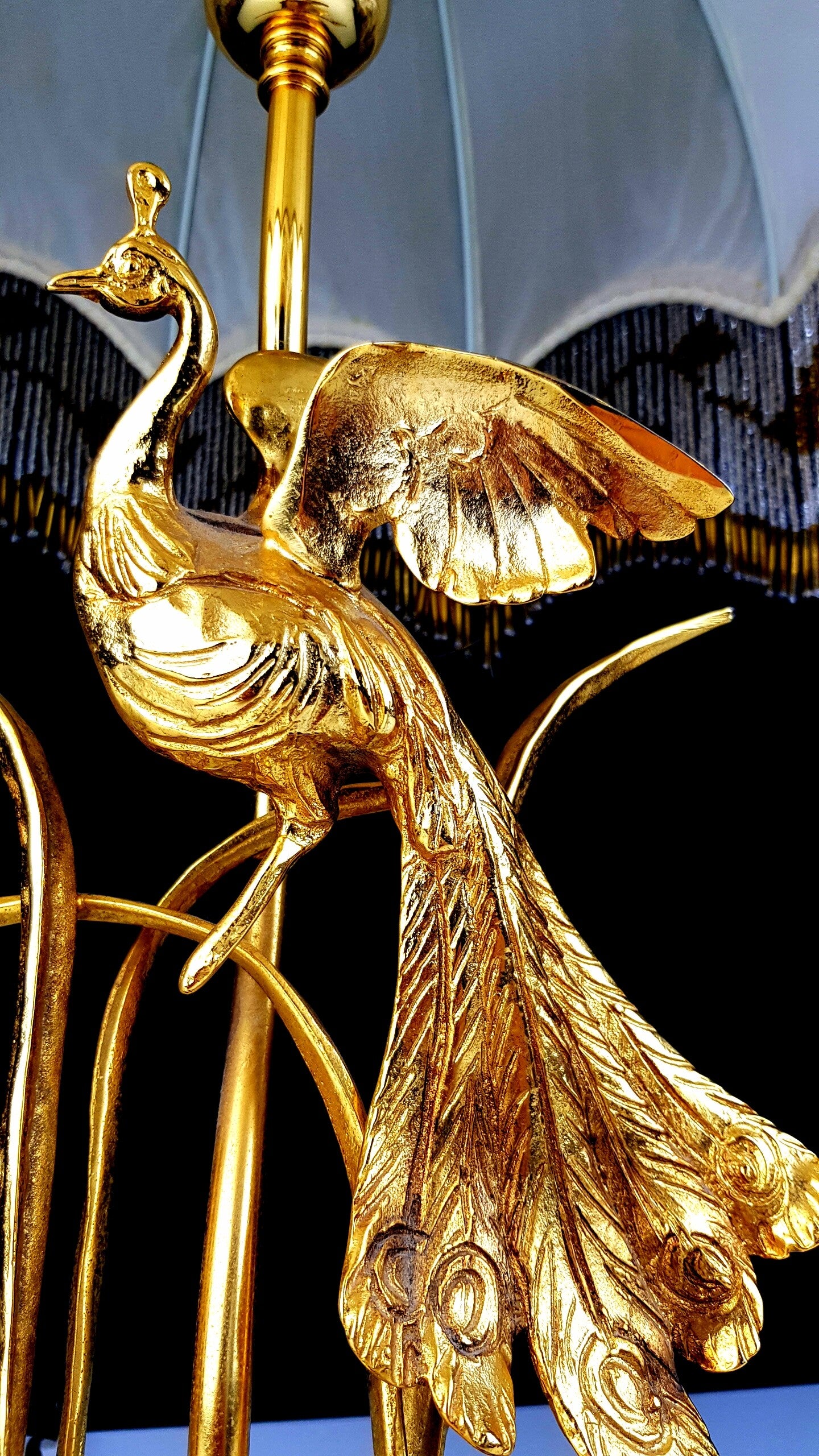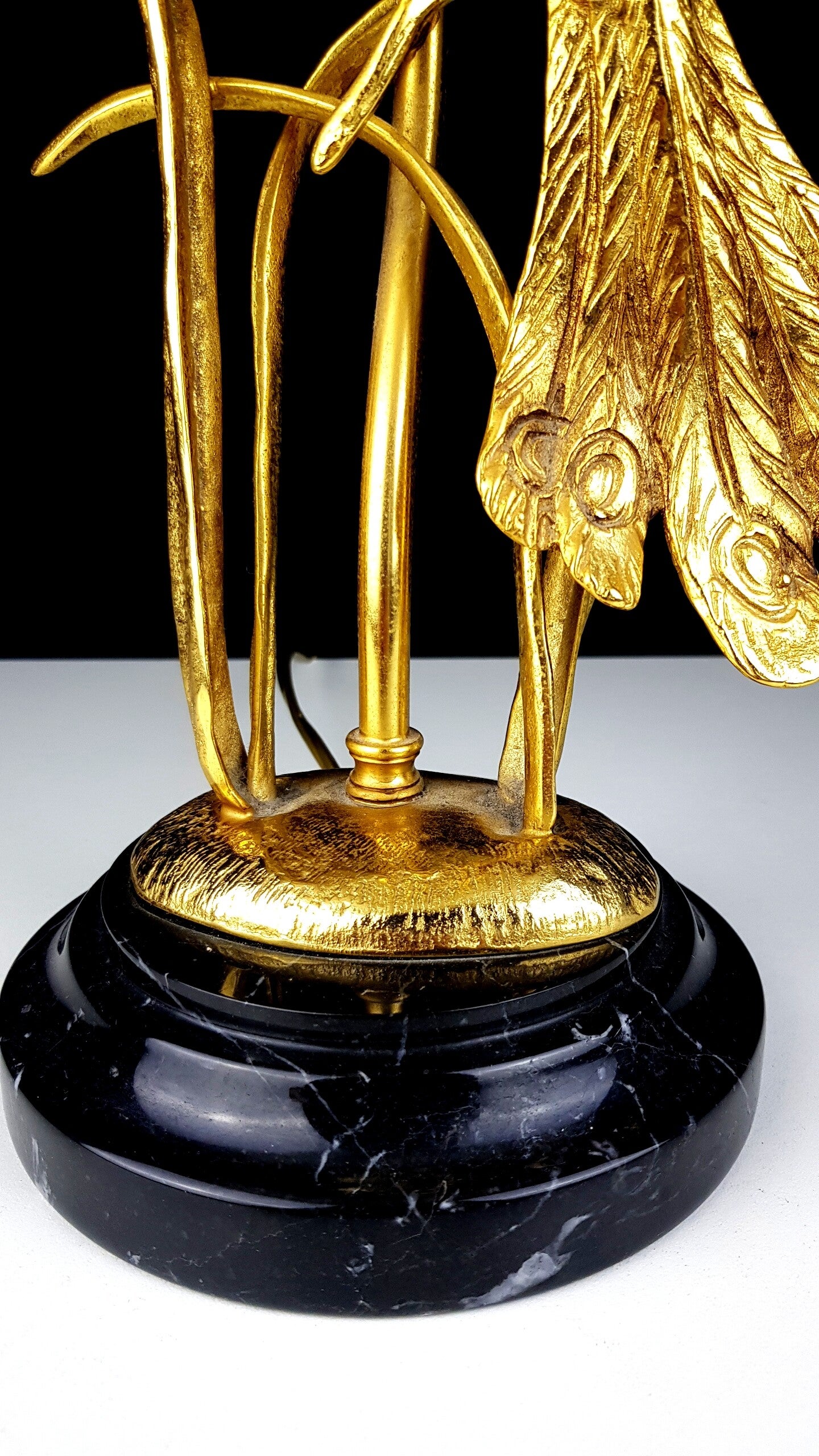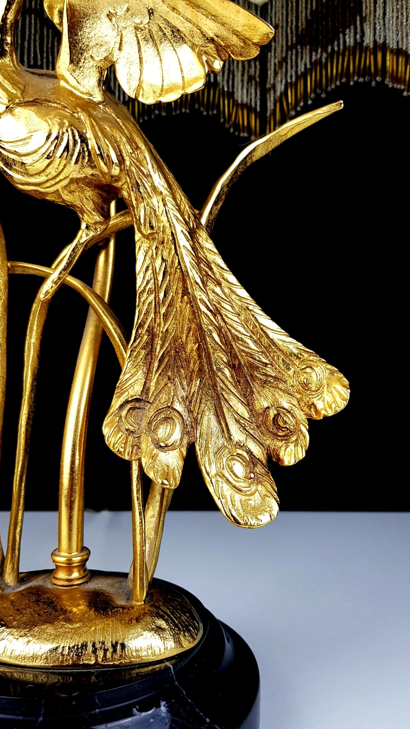This beautiful table lamp with a gilded branch that carries a gold-plated peacock is marked and limited.