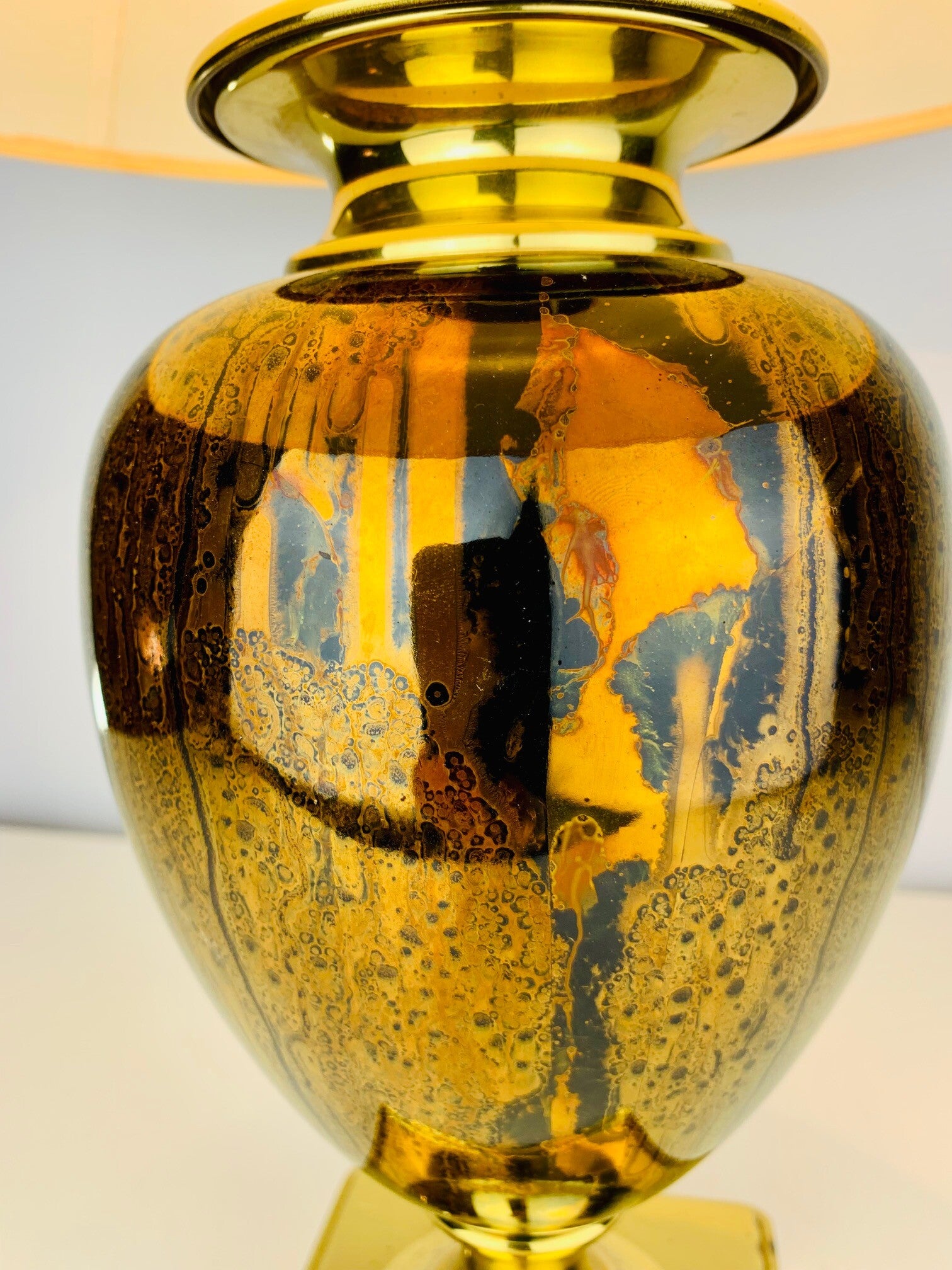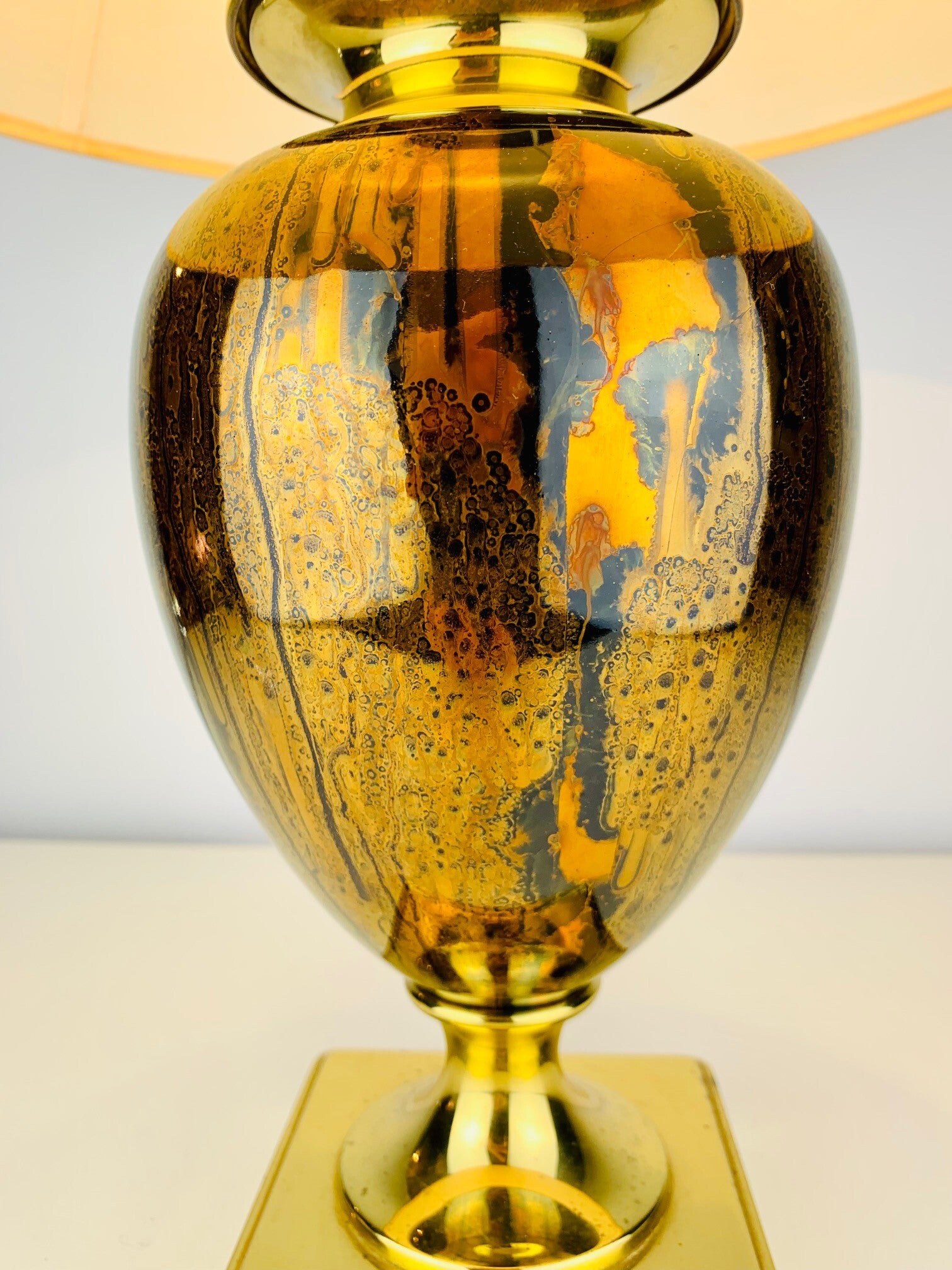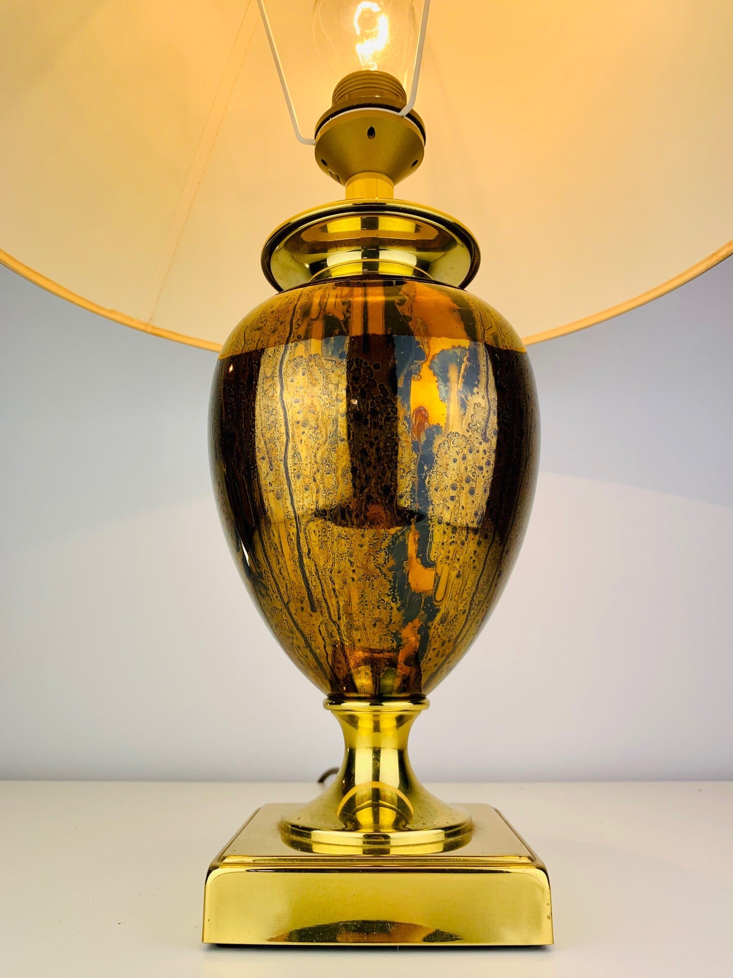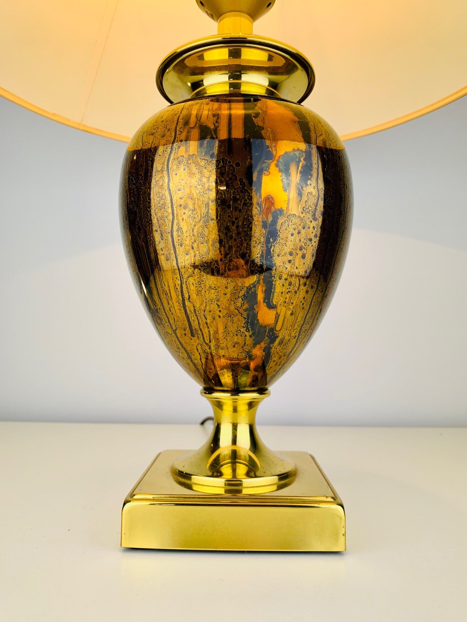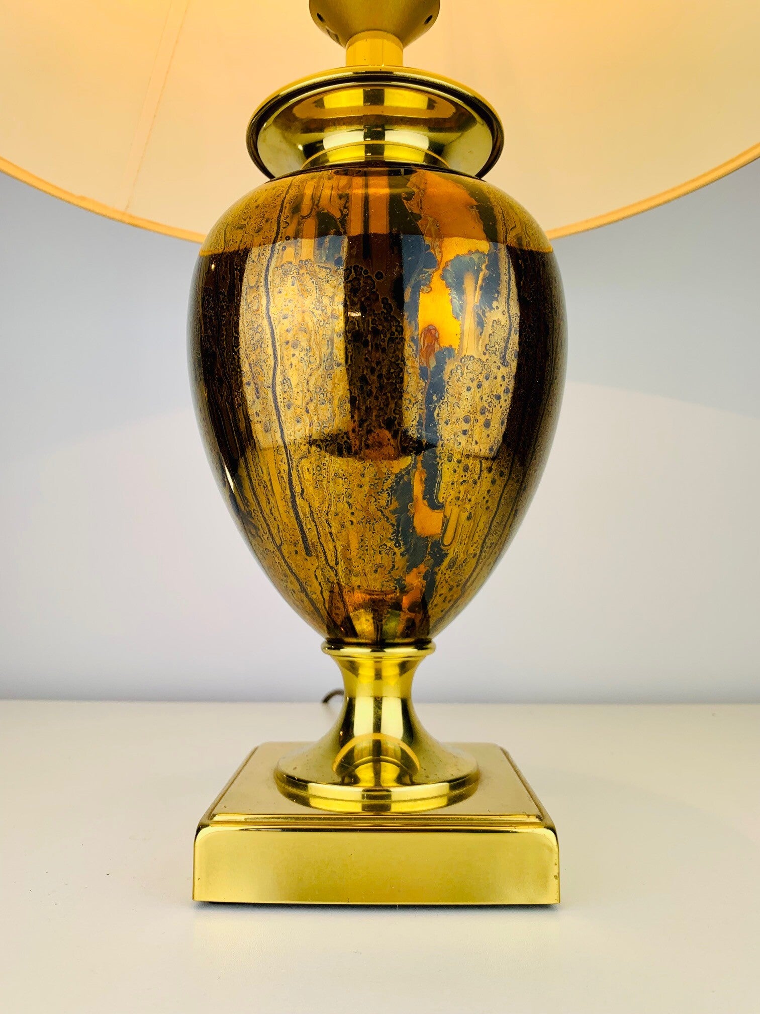 The base of the lamp has a very stylish appearance, due to the use of high-gloss gold cognac colors in a striking pattern that immediately draws attention to itself.