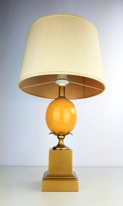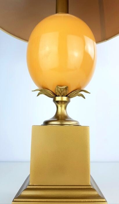 The lamp consists of a square base of brushed brass surmounted by a orange salmon-colored porcelain egg finished with a leaf motif.