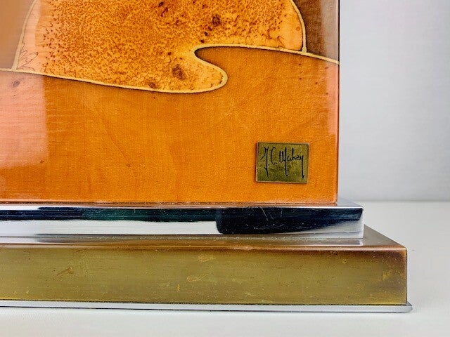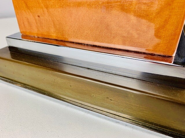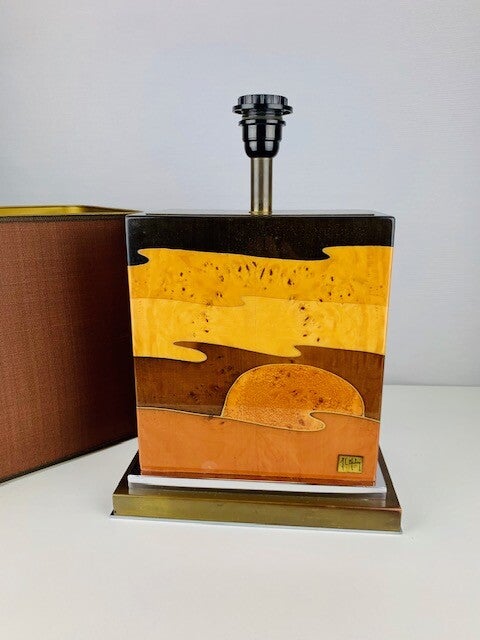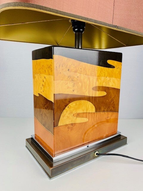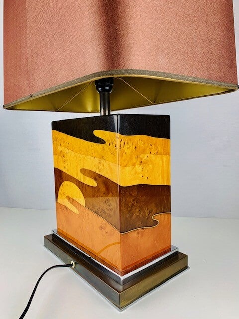 Verry Large Table lamp designed by the french Jean Claude Mahey in Lacquered burlwood with polished nickel and brass.