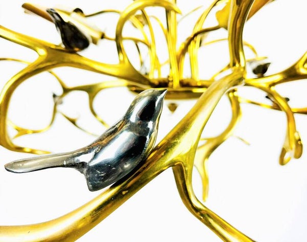 The chandelier with 9 light points represents the branches of a tree with 9 silver-plated birds.