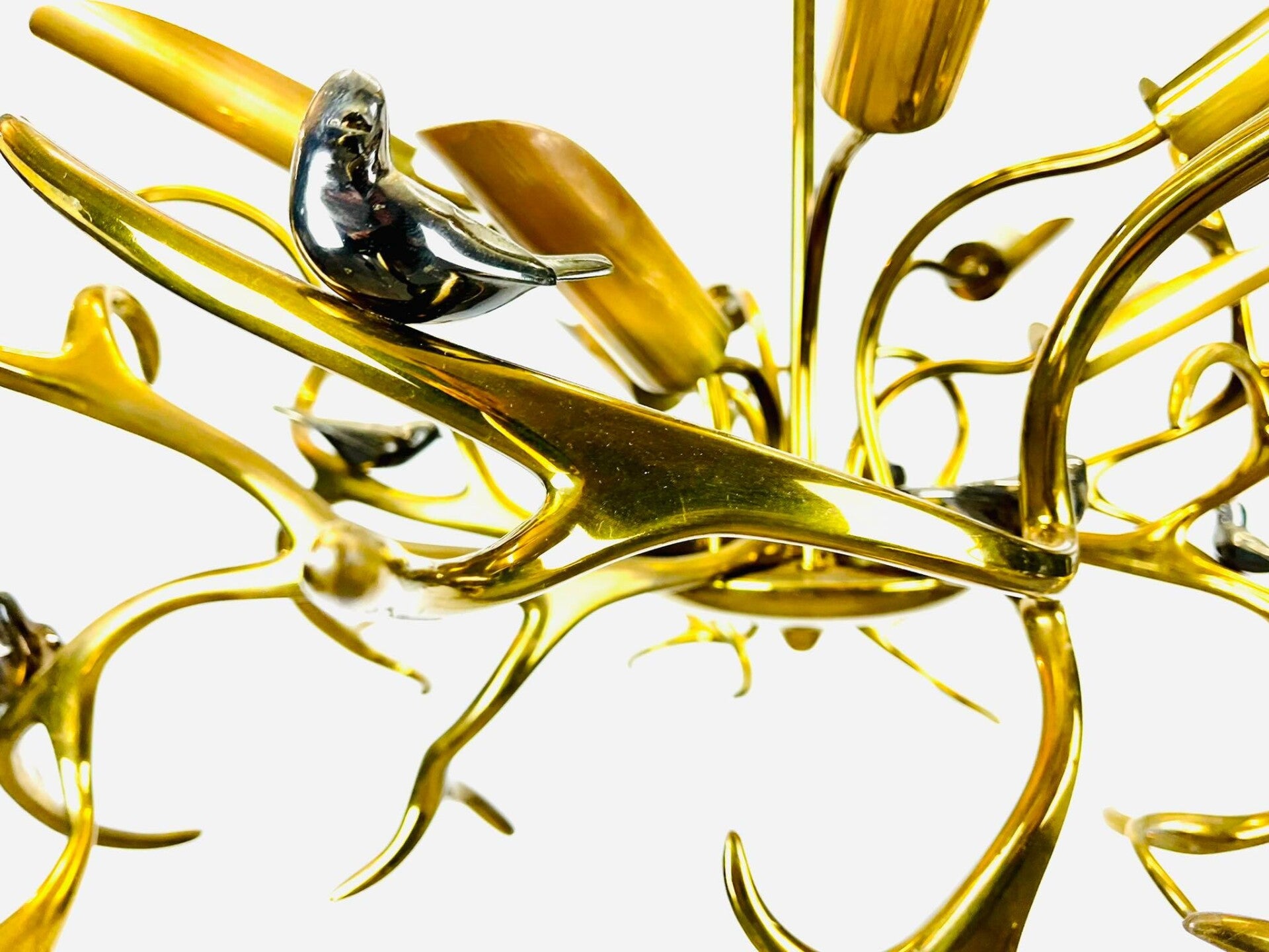 Very striking chandelier of polished brass and silver-plated bronze birds designed by Willy Daro from the 1970s.