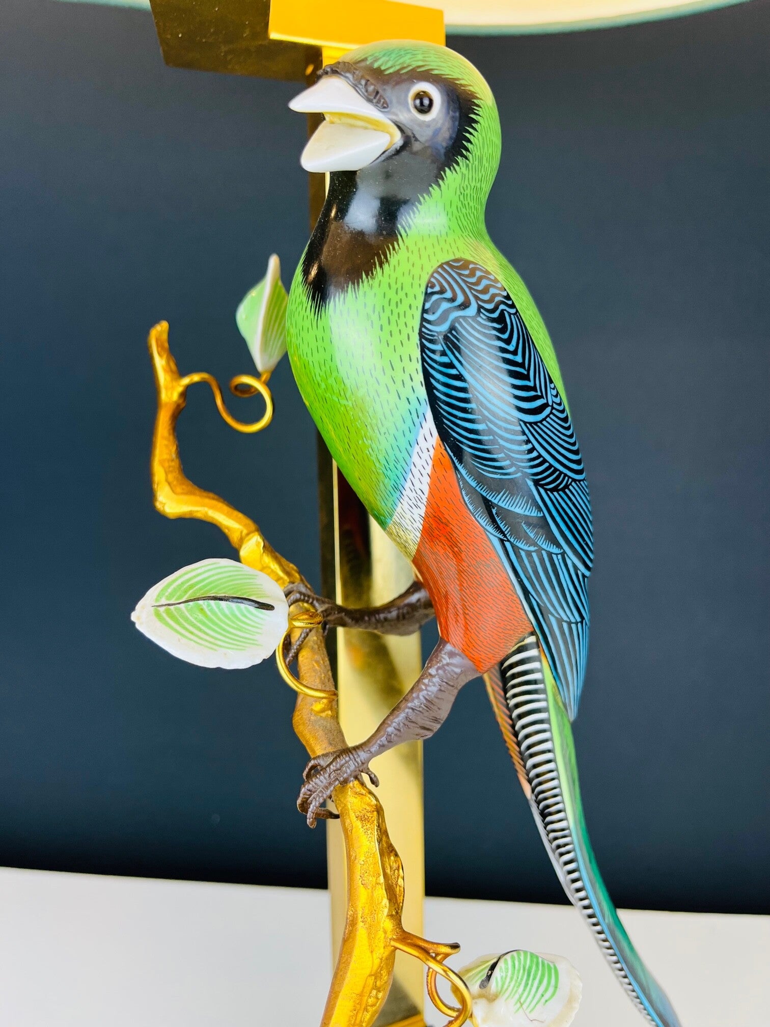 Colorful Amazon bird on a bronze branch with leaves elaborated in porcelain.